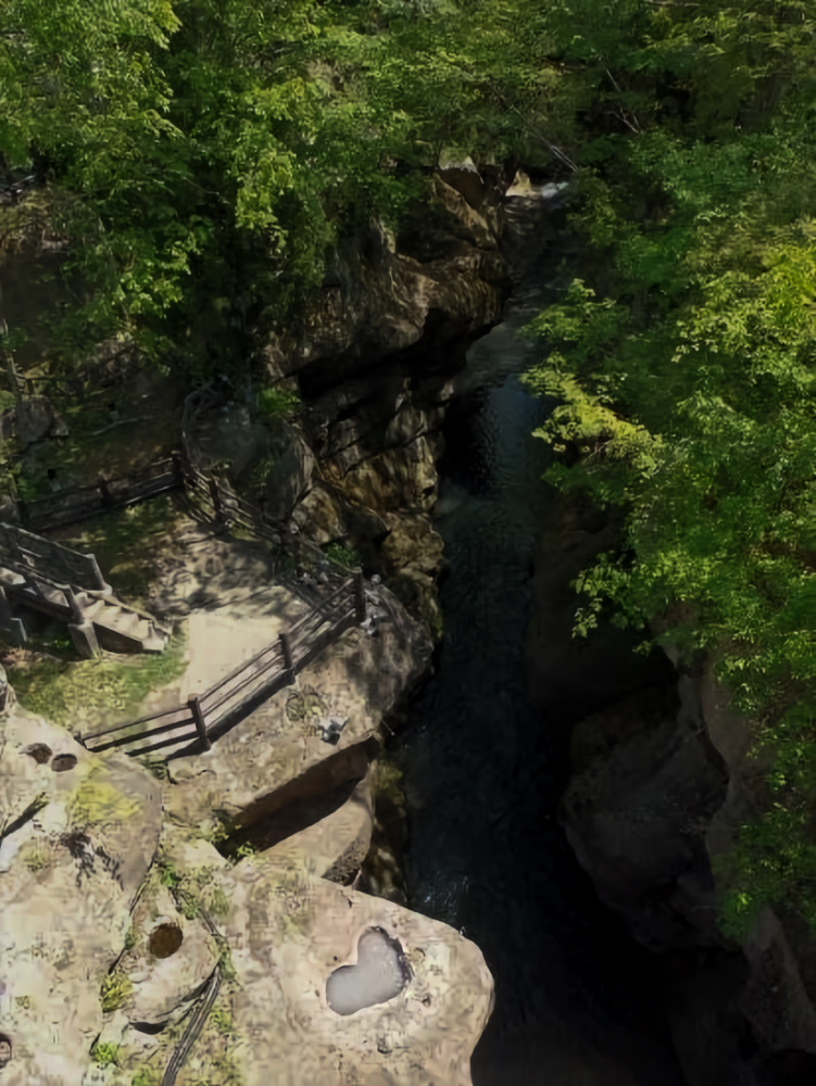 この写真は、宮城県の温泉街にある峡谷のものです。自然にできた岩のくぼみがあり、橋の上から覗くとハートの形に見えることから「恋人の聖地」とも言われています。